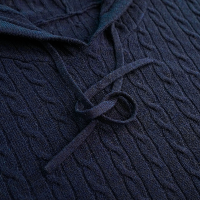 Our Stoll and Shima Seiki machines support 3-12 gauge knitting, enabling everything from lightweight 12gg navy cardigan shells to robust 3gg fisherman sweater outerwear.