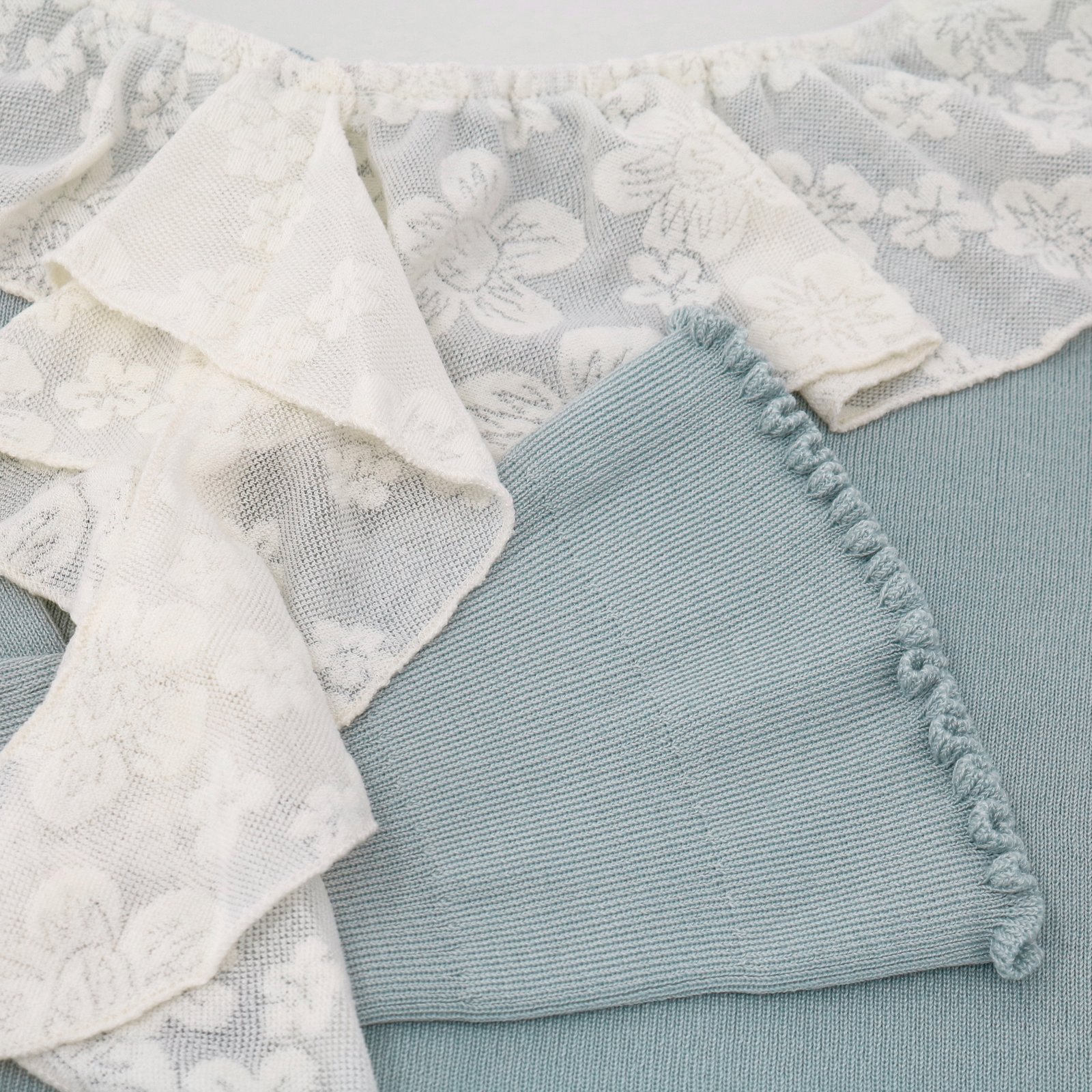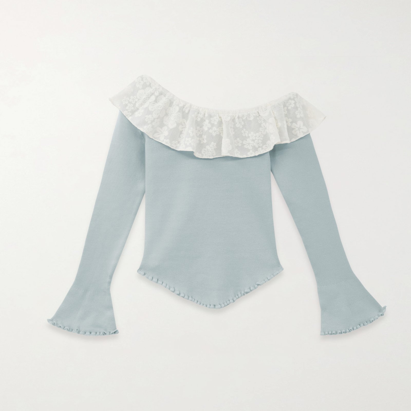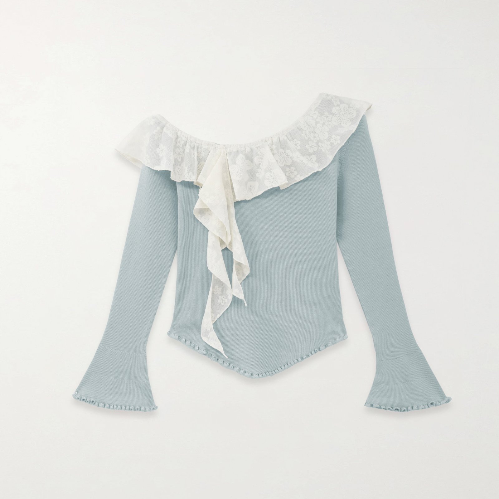 Lace Ruffle Off-Shoulder Top – Sky Blue Knit Blouse