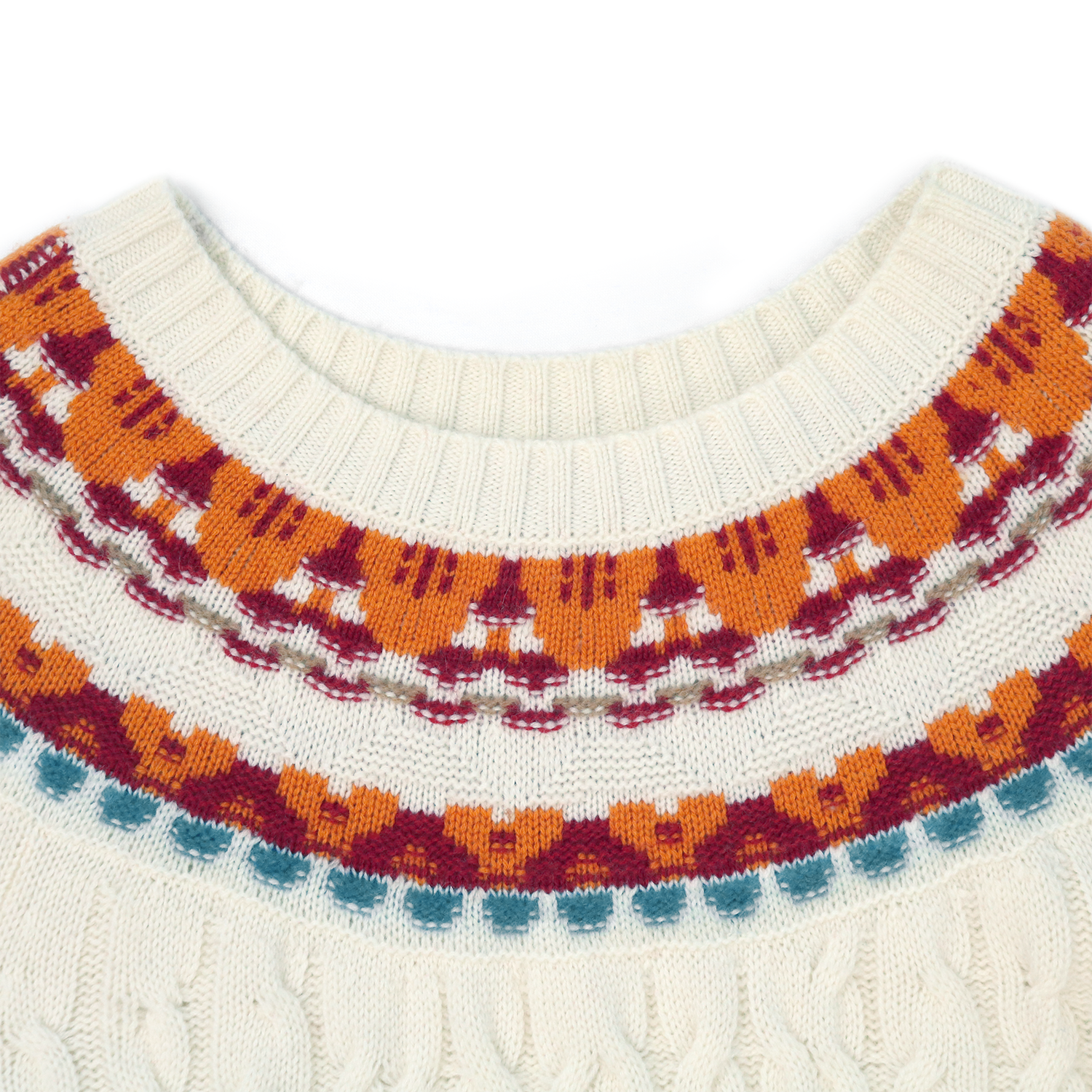 The fair isle sweater women showcases intricate multi-color patterns, rooted in Scottish knitting traditions. Fair Isle jacquard involves precise yarn switching to create geometric motifs, with floating yarns on the garment’s reverse side requiring careful management to avoid snagging.